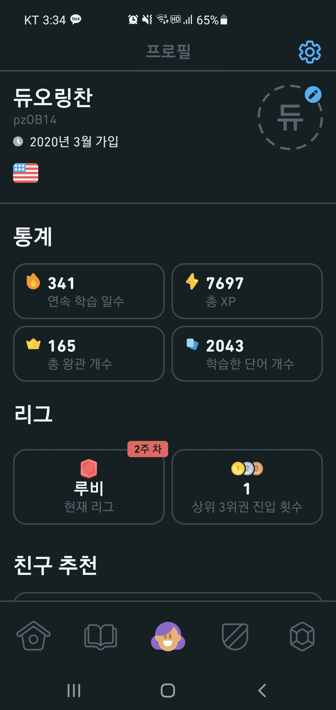 매일매일 한 결과 지금 341일째 진행중이다. 곧 365일, 1년을 하게 된다. 매일매일 한개만 하지만 그 일수가 쌓이니 상당하다. 학습한 단어 개수만 해도 2043개이다. 듀오링고는 성취감을 느낄 수 있게 어플을 제작한 것 같다.
