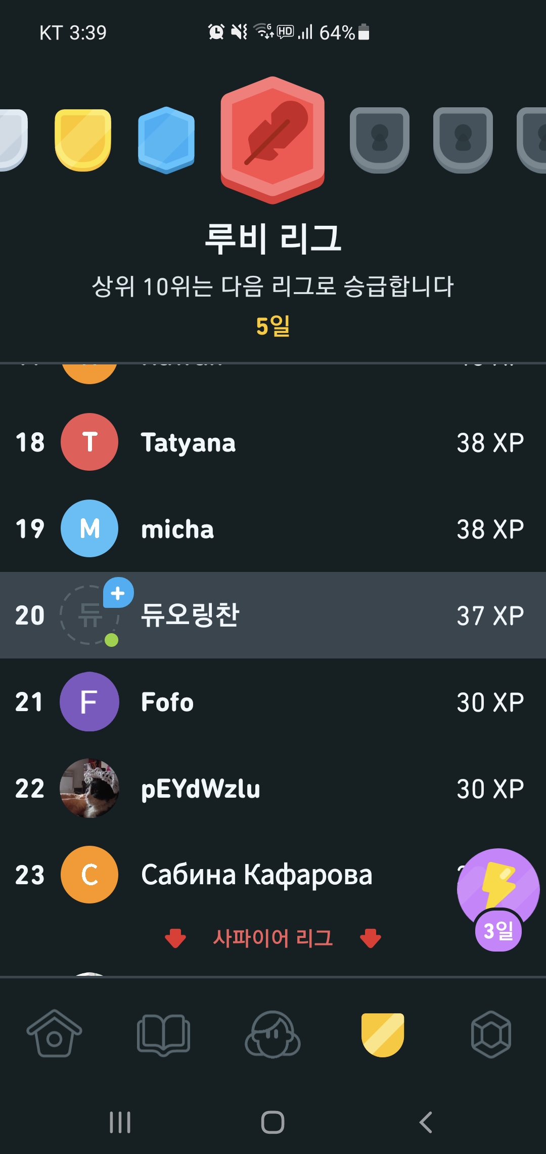학습 진행 상황에 따라 이렇게 랭킹이 매겨지는 것도 재미있다. 마치 게임 티어처럼 리그가 나뉘어져있는데 나는 현재 '루비 등급'이다.