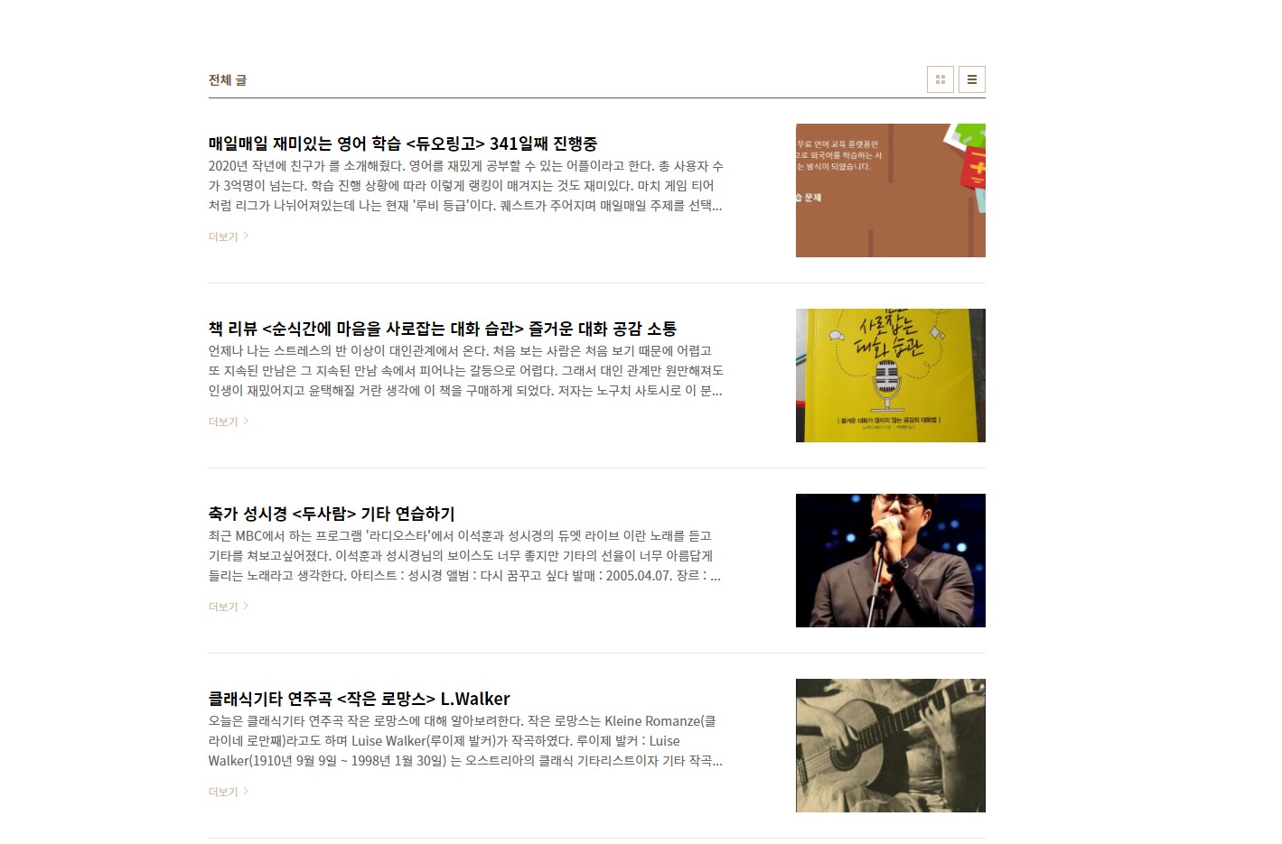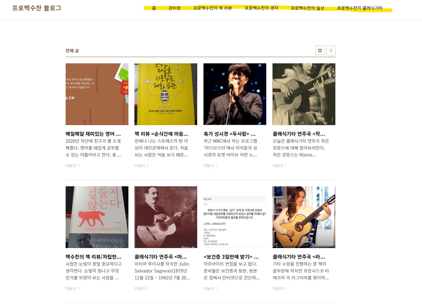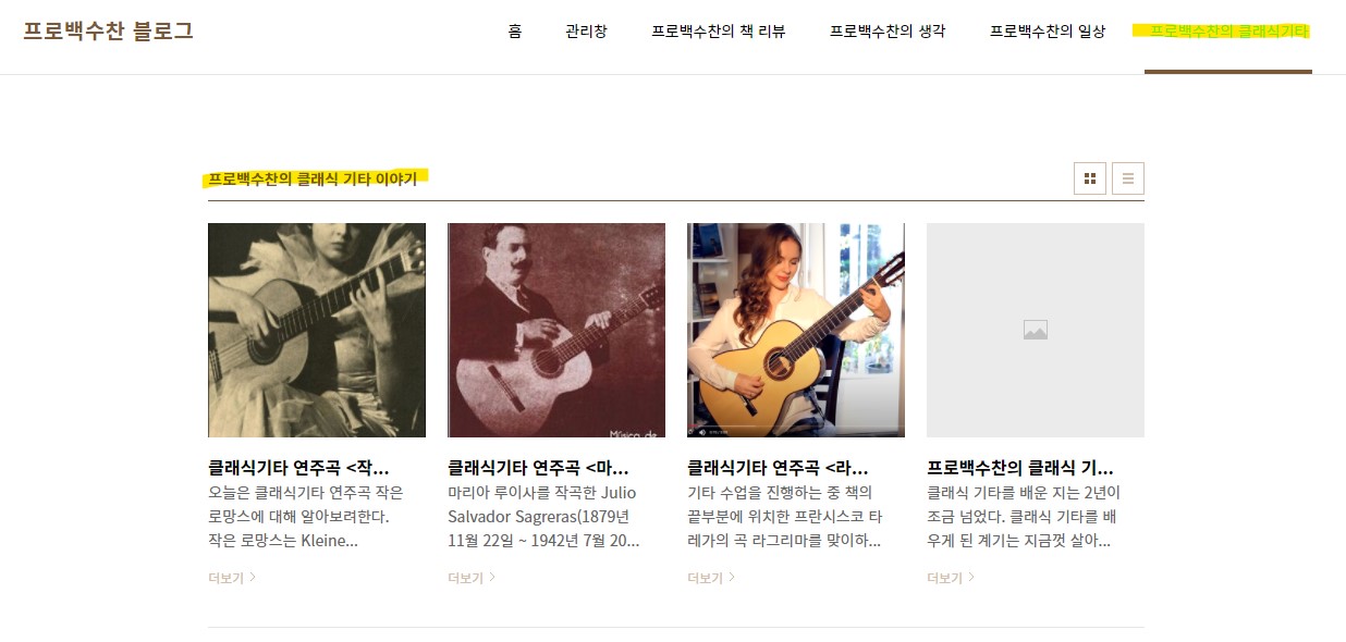 프로백수찬의 클래식기타를 클릭하면 이런식으로 이 카테고리의 글들만 나오게 된다. 내가 바라는 대로 형성되었다. 이 티스토리 블로그의 whatever 스킨은 따로 카테고리의 형식이 있지 않고 메뉴로 만들어서 사람들이 볼 수 있게끔 만든 스킨 형식인 것 같다.