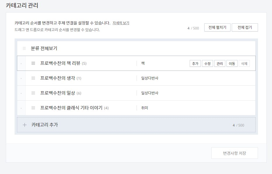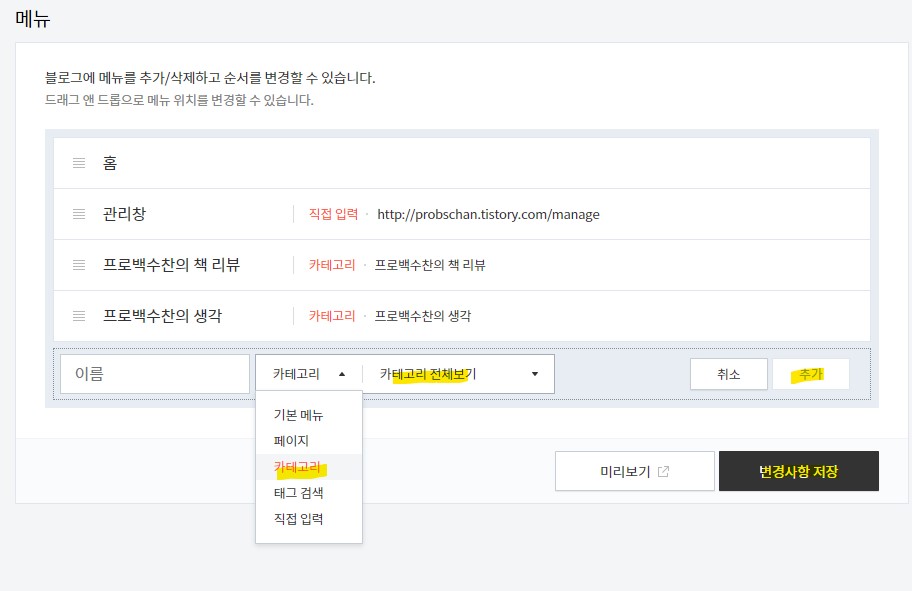 내가 찾은 방법은 메뉴칸을 추가해서 글들을 보기 편하게 카테고리별로 정리하는 거였는데 혹시 다른 방법이 있지 않을까 모르겠다. 더 좋은 방법이 있다면 바꿔봐야겠다.